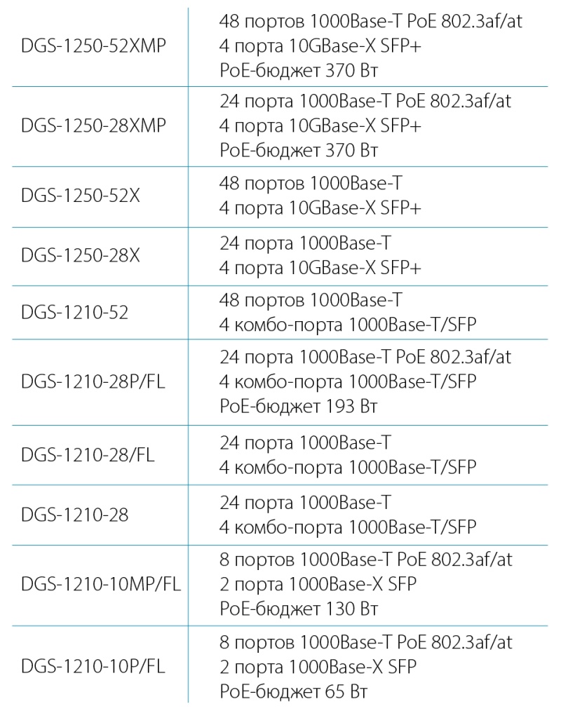 DGS-1250-52XMP – $1 175, DGS-1250-28XMP – $760, DGS-1250-52X – $760, DGS-1250-28X – $304, DGS-1210-52 – $484, DGS-1210-28P/FL – $625, DGS-1210-28/FL – $268, DGS-1210-28 – $240, DGS-1210-10MP/FL – $350, DGS-1210-10P/FL – $259.